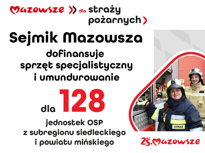 Na Mazowszu działa ok. 2 tysięcy jednostek OSP. Członkini zarządu województwa mazowieckiego Janina Ewa Orzełowska podkreśla, że samorząd województwa mazowieckiego od lat wspiera druhów i druhny z Mazowsza. – Podobnie jest w tym roku. W kwietniu przeznaczyliśmy w sumie 23,5 mln zł na zakup 111 wozów strażackich oraz remonty i modernizacje 233 strażnic. Teraz postanowiliśmy dofinansować wszystkie złożone przez gminy wnioski o wyposażenie jednostek OSP.