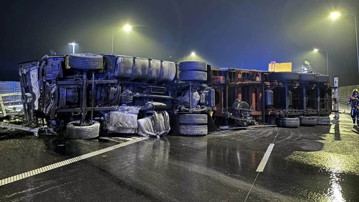 Do wypadku doszło 23 grudnia nad ranem. Samochód ciężarowy wywrócił się na bok i zablokował drogę. Kierowca auta doznał obrażeń.