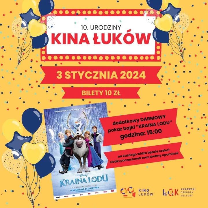 Serdecznie zapraszamy Was wszystkich do świętowania razem z nami 10. rocznicy powstania Kina Łuków. Do zobaczenia 3 stycznia 2024r. w kinie - tam, gdzie marzenia stają się rzeczywistością!