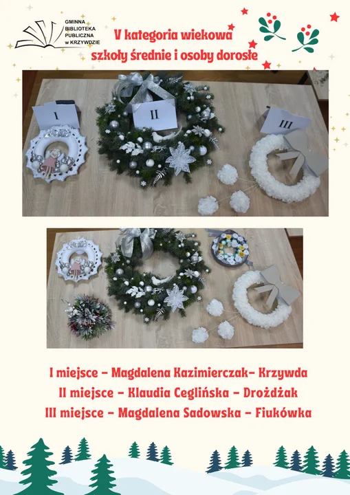 Informacje łukowskieGMINA KRZYWDA Znamy już nazwiska autorów najładniejszych wianków bożonarodzeniowych, które były po raz pierwszy tematem świątecznego konkursu, organizowanego przez Gminną Bibliotekę Publiczną w Krzywdzie. Z nowym wyzwaniem zmierzyło się 33 autorów, którym jury przyznało 17 nagród.