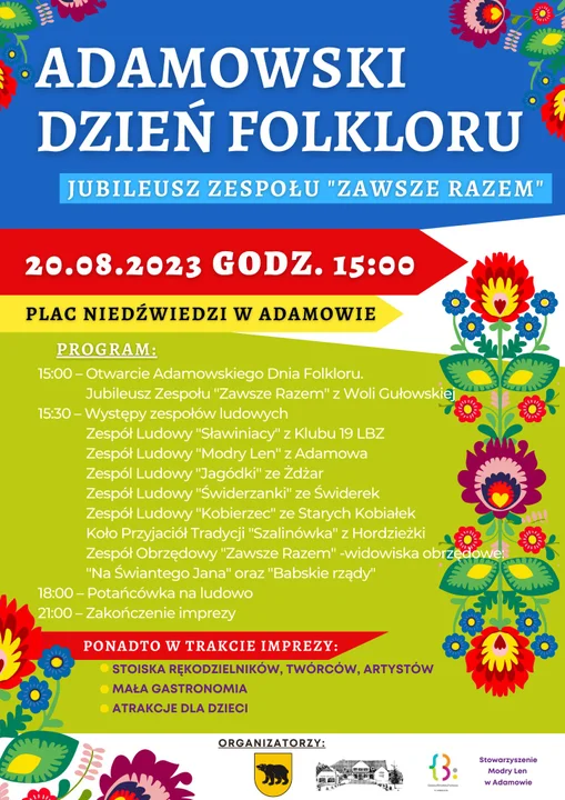 Impreza rozpocznie się 20 sierpnia o godz. 15. W programie Adamowskiego Dnia Folkloru zapowiedziano występ wielu zespołów ludowych z naszego regionu. Organizatorzy zapowiedzieli również atrakcje dla dzieci, małą gastronomię oraz stoiska rękodzielników, twórców i artystów.