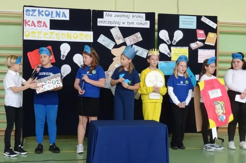 Uczniowie z kl. IV zaprezentowali 27 października inscenizację pt. „Nie zwalniaj kroku, oszczędzaj w tym roku”. Przypomniano, że nie każdy właściwie rozumie oszczędzanie, a więc należy oszczędzać pieniądze i to, co przynosi nam korzyści materialne. W ciekawy sposób i pełen zabawy zachęcano do wytrwałej oszczędności, która pomaga realizować nam wiele planów w życiu. Podpowiadano, jak oszczędzać wodę, energię, papier czy gaz; oszczędzanie na wielu płaszczyznach ułatwia nam życie i uwrażliwia na problemy współczesnego świata.