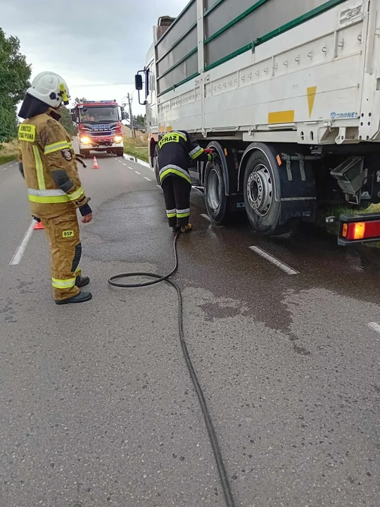 Okazało się, że doszło do awarii układu hamulcowego w ciężarówce, stąd doszło do nagrzania bębna koła. Strażacy sprawdzili temperaturę układu hamulcowego kamerą termowizyjną i schodzili go podając wodę. Na miejscu działały OSP KSRG Adamów, JRG Łuków, Policja. (fot. OSP Adamów)