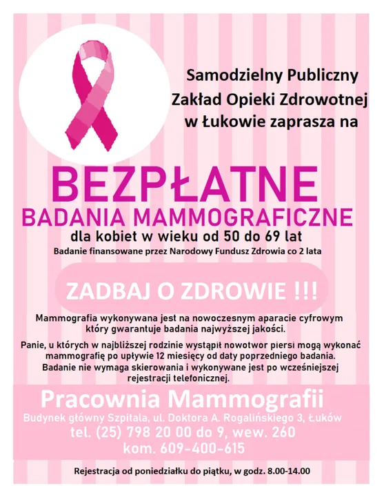 Pracownia mammografii mieści się w budynku głównym szpitala, na ul. Dr Rogalińskiego 3, Łuków, nr tel. 25 798 20 00 do 9 wew. 260, tel. kom. 609 400 615. Rejestracja od poniedziałku do piątku w godz. 8:00 - 14.00.