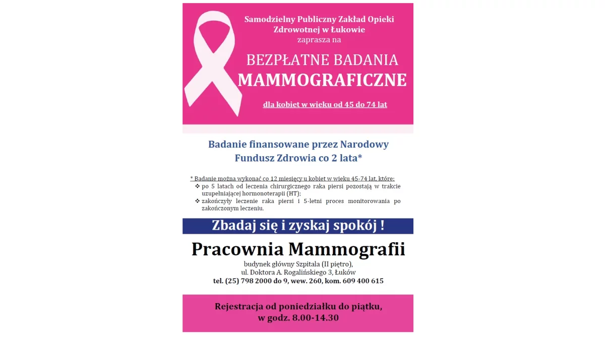 Samodzielny Publiczny Zakład Opieki Zdrowotnej w Łukowie zaprasza na bezpłatne badania mammograficzne dla kobiet w wieku od 45 do 74 lat.