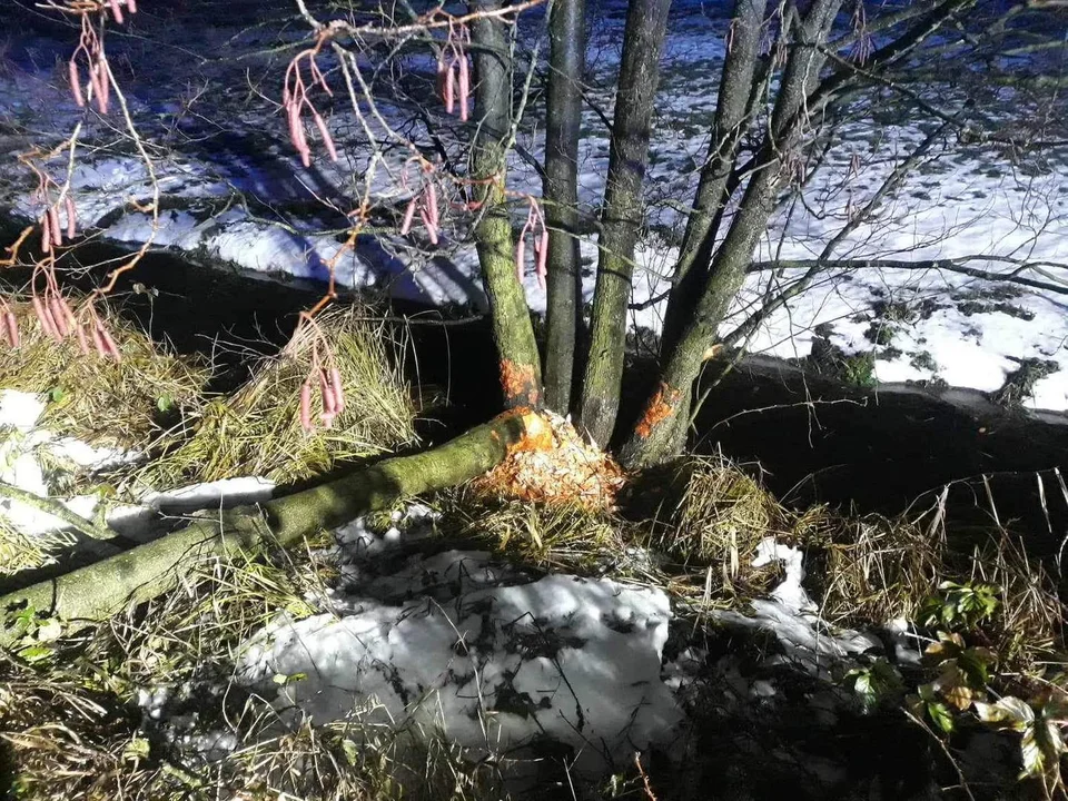 Bobry podgryzły drzewo w taki sposób, że w efekcie potężny konar uległ załamaniu, tworząc niebezpieczną przeszkodę.