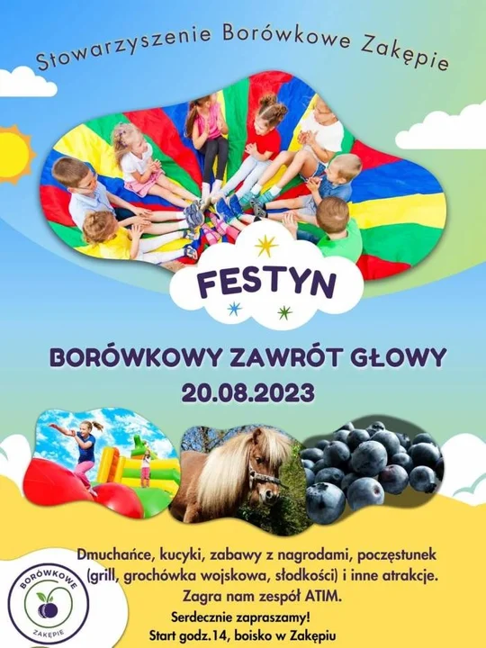 Na imprezę zaprasza stowarzyszenie Oświatowe "Kaganek". Festyn "Borówkowy Zawrót Głowy" odbędzie się 20 sierpnia w urokliwym Zakępiu, start o 14:00.