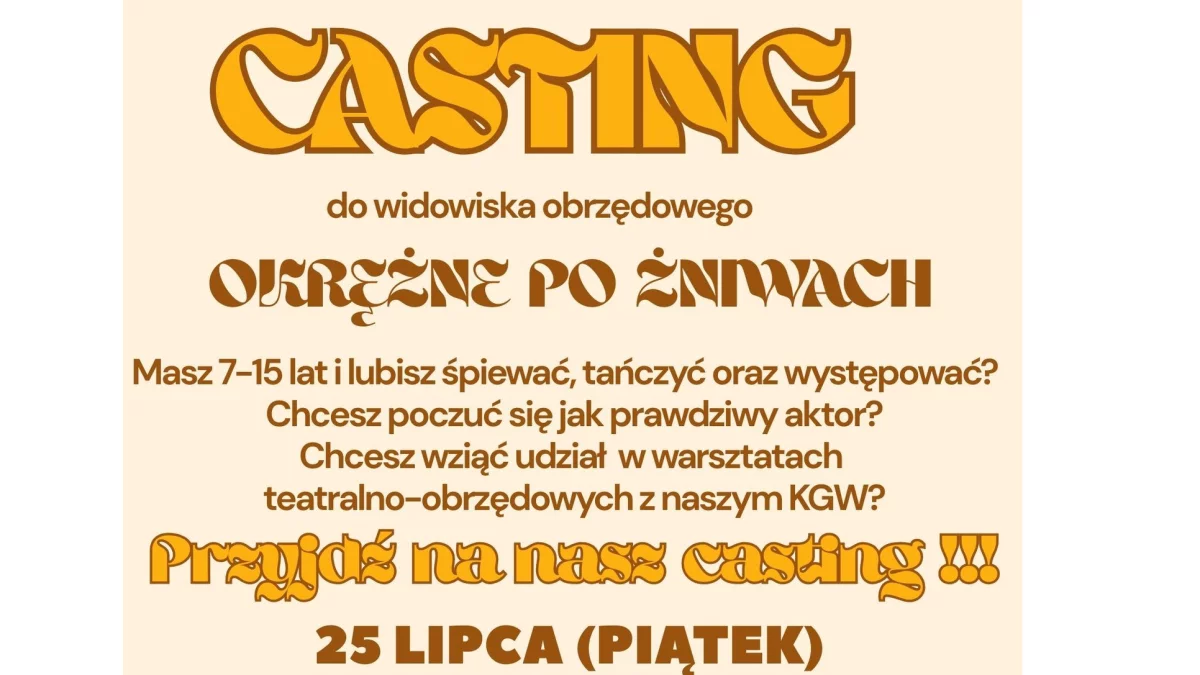 Koło Gospodyń Wiejskich w Turzystwie Zawsze Razem zaprasza dzieci, młodzież w wieku 7-15 lat z terenu Powiatu Łukowskiego do udziału w castingu realizowanym w ramach zadania publicznego w zakresie pielęgnowania tradycji i zwyczajów przez Koła Gospodyń Wiejskich, dofinansowanego ze środków Powiatu Łukowskiego. Casting odbędzie się 25 lipca o godzinie 19.00 w świetlicy wiejskiej w miejscowości Turzystwo. Osoby zakwalifikowane do widowiska obrzędowego będą brały czynny udział w warsztatach teatralno- obrzędowych, które odbędą się w sierpniu. Warsztaty będą przygotowywać uczestników do widowiska obrzędowego "OKRĘŻNE PO ŻNIWACH", którego premiera odbędzie się 8 września podczas dożynek diecezjalnych w Woli Gułowskiej.