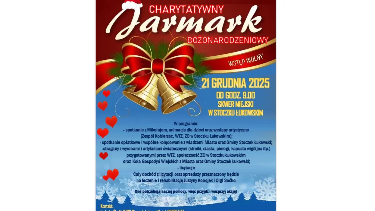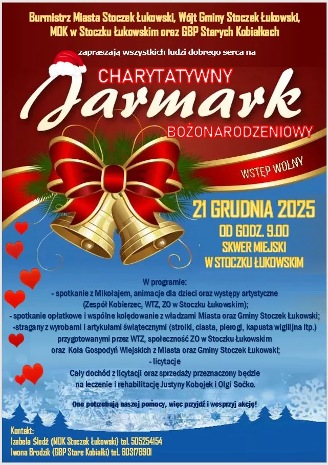 Cały dochód z licytacji oraz sprzedaży zostanie przeznaczony na leczenie i rehabilitację Justyny Kobojek i Olgi Soćko. Organizatorzy zachęcają mieszkańców do udziału w wydarzeniu i wsparcia akcji charytatywnej. Kontakt w sprawie jarmarku: Izabela Śledź (MOK Stoczek Łukowski), tel. 505 254 154 oraz Iwona Brodzik (GBP Stare Kobiałki), tel. 603 176 901.