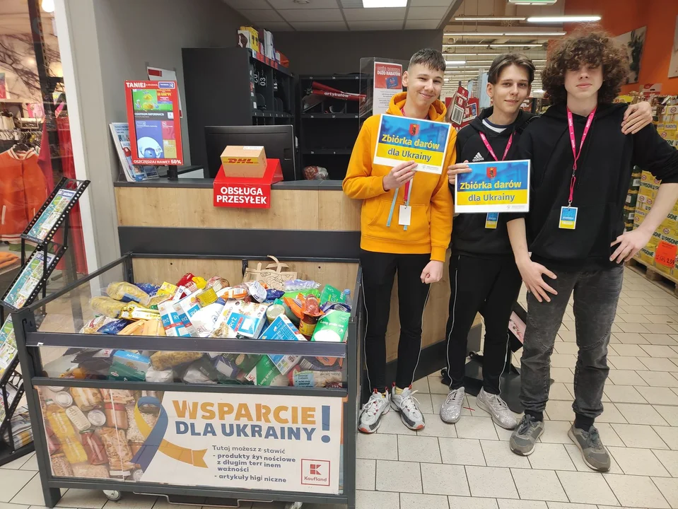 Wolontariusze z łukowskiej „Czwórki” zbierali m.in. żywność o długim terminie przydatności do spożycia, a także artykuły higieniczne i kosmetyczne. Uczniowie i nauczyciele z wielkim zaangażowaniem włączyli się w to szlachetne przedsięwzięcie. Akcja przybrała szeroki rozmach. Opiekunowie i uczniowie z duma patrzyli na rosnącą z godziny na godzinę ilość darów. Zapał malujący się na twarzy Wolontariuszy pokazywał, jak bardzo zależy im na wsparciu tych, którzy stali się naszymi gośćmi. Dary, które podarowali mieszkańcy Łukowa i osoby robiące zakupy w hipermarkecie, trafiły następnie do Miejskiego Punktu Pomocy dla Ukraińców, zlokalizowanego przy ul. Wyszyńskiego 32. W miejscu tym świadczona jest pomoc rzeczowa dla uciekinierów zza wschodniej granicy, którzy w wyniku wojny trafili właśnie do Łukowa. - Serdecznie dziękujemy wszystkim za każdy ofiarowany dar, za troskę o losy innych, za pomoc w transporcie darów do miejsc zbiórki. Drodzy łukowianie, uczniowie, nauczyciele, kolejny raz pokazaliście, że nie brak wśród nas ludzi o wielkim sercu – przekazują wolontariusze i opiekunowie: Agnieszka Bryła,Katarzyna Nowicka i Hubert Dybciak.