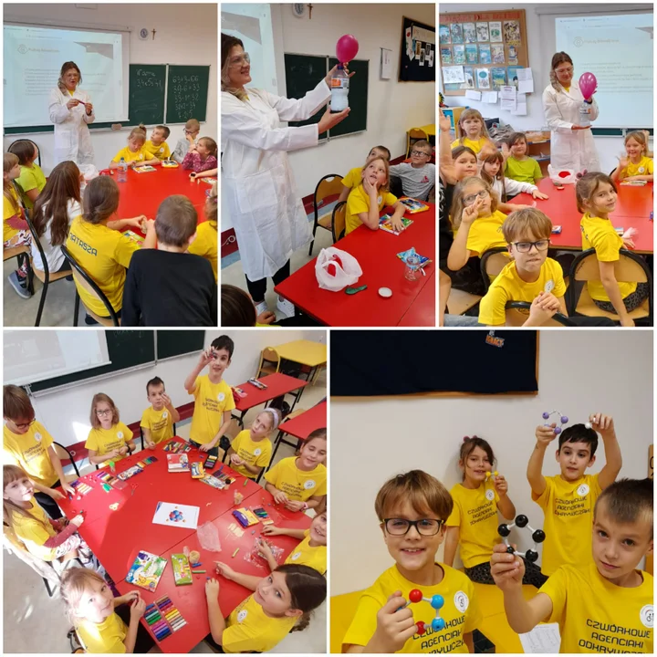 Dużo emocji wzbudził temat cząstek elementarnych i chemii w życiu codziennym. Drugoklasiści poznali wybitną postać z dziedziny fizyki i chemii - Marię Skłodowską – Curie. Podczas zajęć podążali śladami noblistki, odkrywając tajniki wiedzy. Poprzez praktyczne działanie zdobyli informacje na temat pierwiastków oraz zbudowali różne atomy wykorzystując profesjonalne modele, a także plastelinę. Agenciaki przeprowadziły eksperymenty chemiczne.