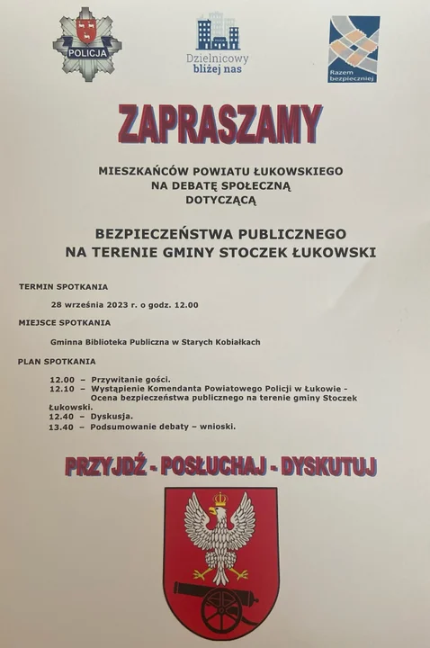 Zaproszeni są wszyscy zainteresowani tym tematem mieszkańcy gminy i nie tylko. W planie spotkania: godz. 12 przywitanie gości, godz. 12.10 wystąpienie Komendanta Powiatowego Policji w Łukowie i ocena bezpieczeństwa publicznego na terenie gminy Stoczek Łukowski, godz. 12.40 dyskusja, godz. 13.40 podsumowanie debaty i wnioski. Organizatorzy zapraszają, aby przyjść, posłuchać i podyskutować.