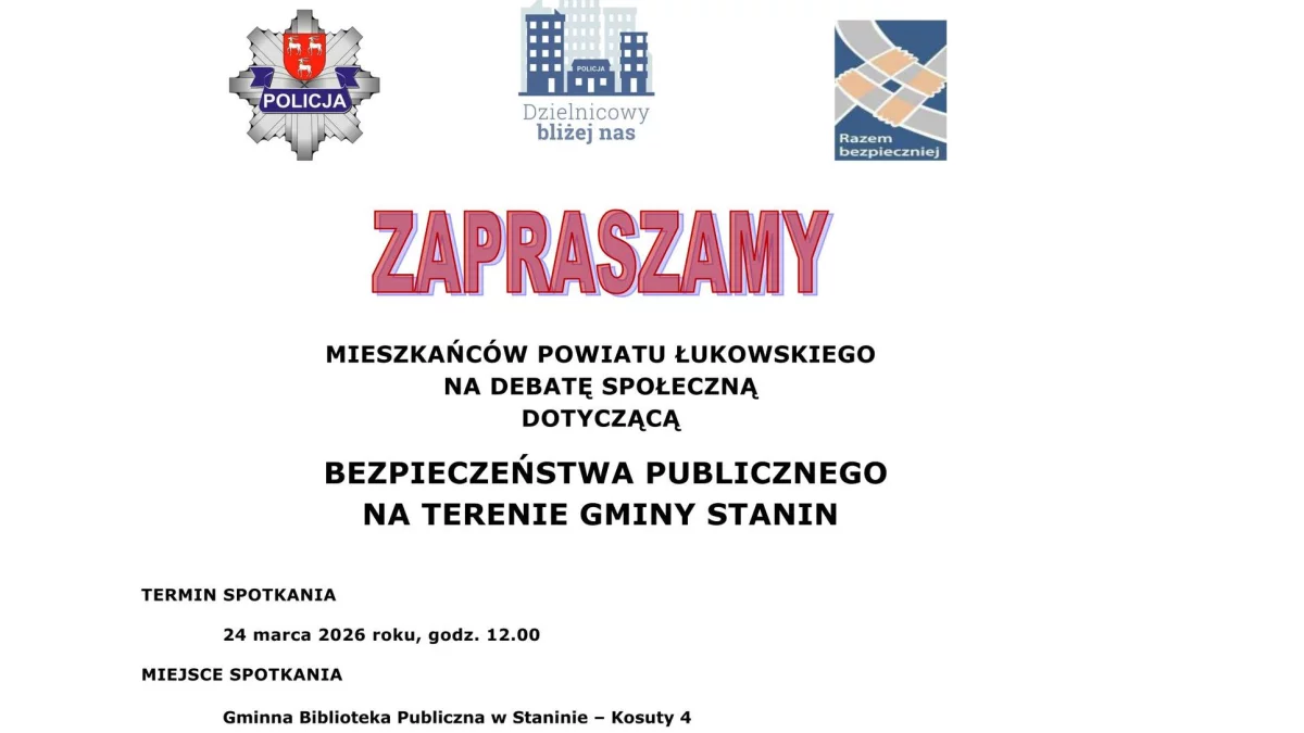 Debata społeczna dotycząca bezpieczeństwa publicznego na terenie gminy Stanin odbędzie się we wtorek, 24 marca 2026 roku o godz. 12.00 w Gminnej Bibliotece Publicznej w Staninie (Kosuty 4).