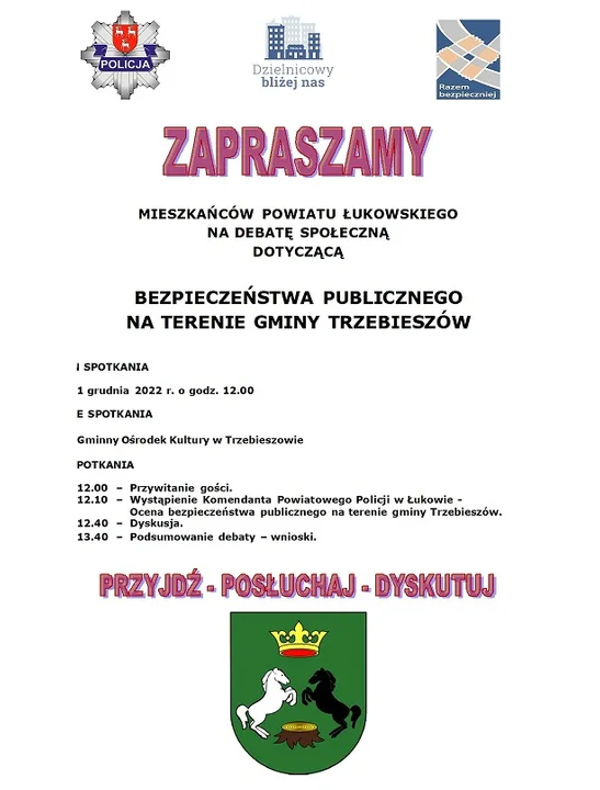 Realizując jedno z priorytetowych zadań naszej formacji, jakim jest zacieśnianie współpracy ze społecznością lokalną, chcielibyśmy zaprosić Państwa do udziału w kolejnym spotkaniu w ramach cyklu debat społecznych. Już 1 grudnia 2022 roku o godzinie 12.00 w Gminnym Ośrodku Kultury w Trzebieszowie, policjanci, strażacy i przedstawiciele samorządu będą między innymi oczekiwali na spostrzeżenia, uwagi i sugestie mieszkańców naszego regionu, dotyczące ich bezpieczeństwa.