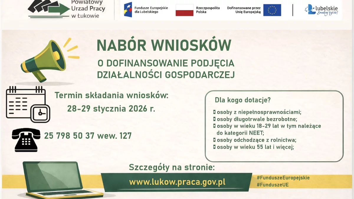 Wnioski należy składać w Powiatowym Urzędzie Pracy w Łukowie w dniach 28 lub 29 stycznia. Warunkiem udziału w naborze jest prawidłowe wypełnienie dokumentów.