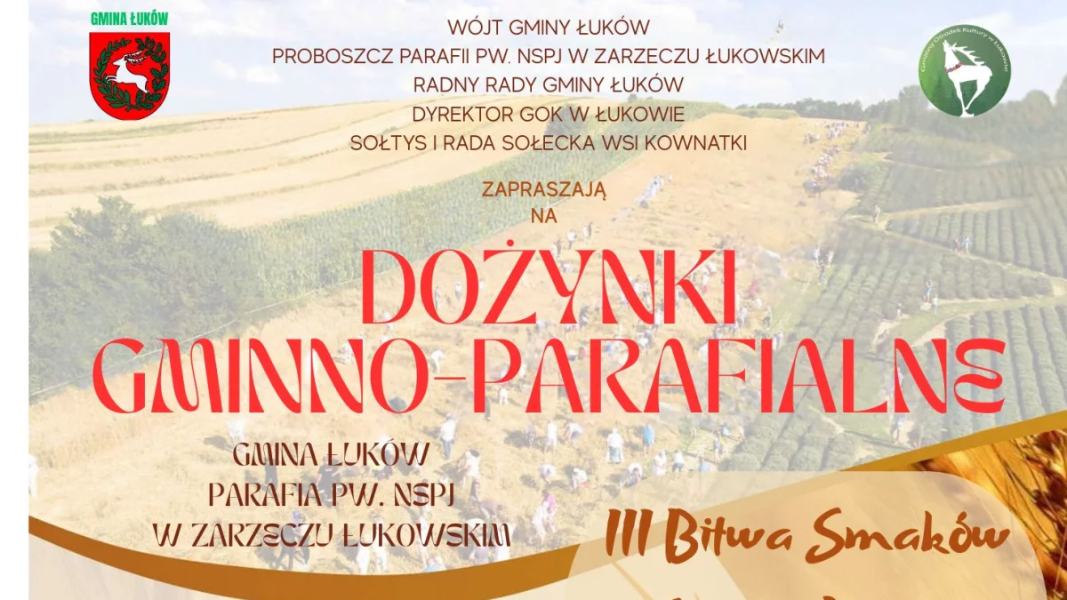 Podczas eucharystii zostaną poświęcone wieńce dożynkowe i symboliczny bochen chleba, wypieczony z tegorocznych zbóż, który starostowie uroczyście przekażą przedstawicielom władz samorządowych. Kolejnym tradycyjnym elementem tej części obchodów, będzie obrzęd dożynkowy, który w tym roku przygotowuje zespół "Niezapominajki" z Dminina. Grupa wystąpi również na rodzinnym festynie, który rozpocznie się w Kownatkach po mszy świętej. Oprócz niej w części artystycznej na dożynkowej scenie zaprezentują się inne zespoły z gminy Łuków: "Kumpele" z Gręzówki, "Jagódki" ze Żdżar, "Krzepkie babki" z Zarzecza Łukowskiego oraz Zespół Pieśni i Tańca "Jata".W niedzielne popołudnie poznamy także laureatów konkursów na najładniejszy wieniec, najciekawsze stoisko promocyjne i najsmaczniejszy chleb. Udział w konkursie wieńców dożynkowych zgłosiło 17 grup, a w konkursie stoisk promocyjnych weźmie udział 14 sołectw, kół gospodyń wiejskich i ochotniczych straży pożarnych. Z kolei w nowej edycji "Bitwy smaków gminy Łuków", której tematem jest chleb, jury oceni 13 propozycji.Muzycznie święto plonów w Kownatkach uświetnią występy zespołu "Modem" i Grupy "Szwajcar Band", wykonujących polskie i zagraniczne przeboje muzyki rozrywkowej i biesiadnej.