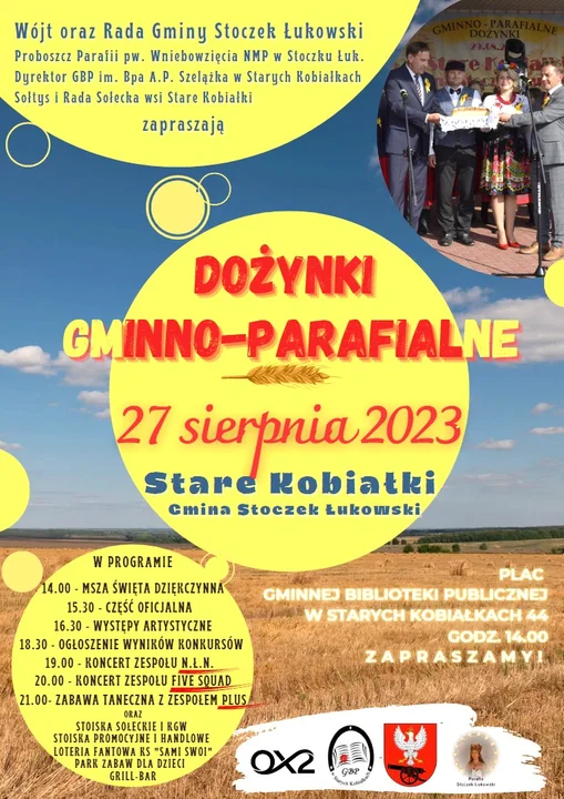 Organizatorzy zaplanowali również występy zespołów N.Ł.N. (godz. 19.00), Five Squad (godz. 20.00) oraz zabawę taneczną z zespołem Plus. W programie wydarzenia znalazły się również stoiska sołeckie i KGW, stoiska promocyjne i handlowe, loteria fantowa ks "Sami Swoi", park zabaw dla dzieci oraz grill-bar.