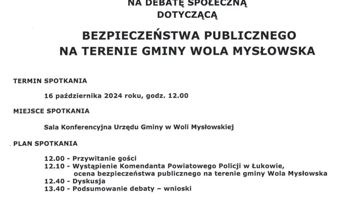 W tym celu serdecznie zapraszamy mieszkańców powiatu łukowskiego, na debatę społeczną poświęconą bezpieczeństwu publicznemu na terenie gminy Wola Mysłowska, która odbędzie się 16 października 2024 roku o godzinie 12.00 w Sali Konferencyjnej Urzędu Gminy w Woli Mysłowskiej.