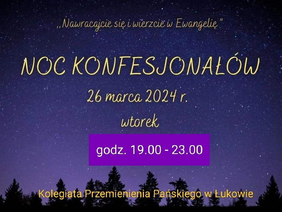 Kto chciałby się wyspowiadać, może dzisiaj we wtorek 26 marca przyjść do Kolegiaty - Kościoła Przemienienia Pańskiego w Łukowie w godz. 19.00 – 23.00. Adoracja Najświętszego Sakramentu, również do godz. 23.00.