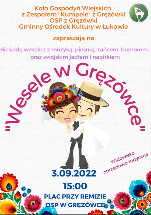 Festyn i "Wesele w Gręzówce". Już w sobotę 3 września | 1 / 21 / 2«‹12›»GMINA ŁUKÓW Koło Gospodyń Wiejskich z Zespołem "Kumpele" z Gręzówki, OSP z Gręzówki, Gminny Ośrodek Kultury w Łukowie zapraszają w sobotę 3 września na imprezę pod nazwą "Wesele w Gręzówce".