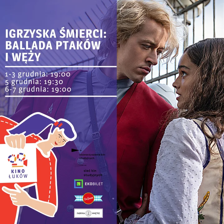 Jest to kontynuacja ekranizacji światowego bestsellera o Głodowych Igrzyskach. Film będzie wyświetlany w Kinie Łuków w dniach 1-3 i 6-7 grudnia 2023r. o godz. 19:00 oraz 5 grudnia 2023r. o godz. 19:30.