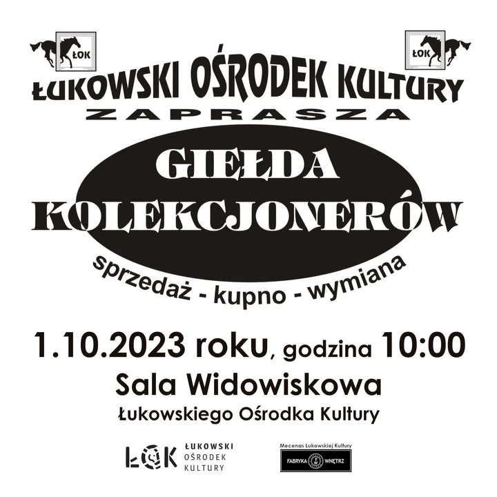 Informacje łukowskieŁukowski Ośrodek Kultury zaprasza na kolejną Giełdę Kolekcjonerów. Wydarzenie odbędzie się w niedzielę 1 października od godziny 10:00 w sali widowiskowej ŁOK.