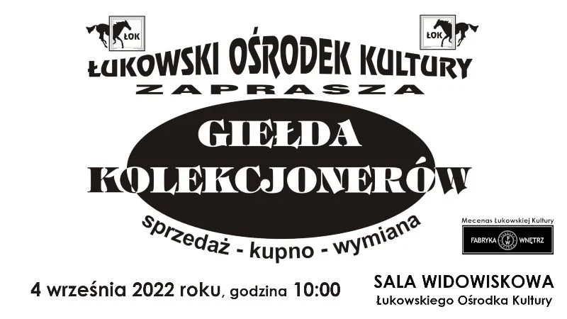 Informacje łukowskieŁUKÓW Kolejna Giełda Kolekcjonerów odbędzie się w niedzielę 4 września od godziny 10:00 w sali widowiskowej ŁOK.