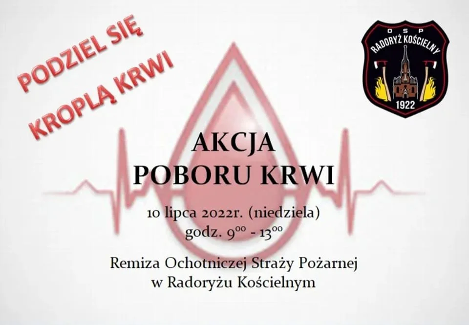 Loading...GMINA KRZYWDA W Radoryżu Kościelnym możesz oddać krew. W niedzielę 10 lipca | 1 / 21 / 2«‹12›»Ochotnicza Straż Pożarna w Radoryżu Kościelnym zaprasza i zachęca do udziału w akcji poboru krwi, która odbędzie się już w najbliższą niedzielę 10 lipca w godzinach 9.00 - 13.00 w remizie OSP.