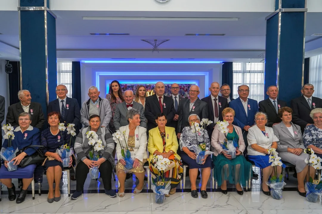Wójt Mariusz Osiak odznaczył jubilatów, nadanymi przez Prezydenta RP medalami „Za Długoletnie Pożycie Małżeńskie” oraz złożył małżonkom życzenia kolejnych lat wspólnego życia. Do życzeń dołączyli zastępca wójta Wojciech Szczygieł, kierownik Urzędu Stanu Cywilnego Anna Zemło oraz jej zastępczyni Bożena Krukow. W części artystycznej przed jubilatami wystąpił Zespół Pieśni i Tańca „Jata”.