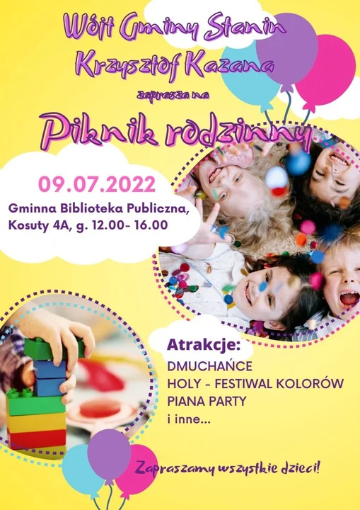 Wójt Gminy Stanin Krzysztof Kazana zaprasza na piknik rodzinny 9 lipca (sobota) W g.12-16.00 na placu przy Gminnej Bibliotece Publicznej w Staninie, Kosuty 4A.