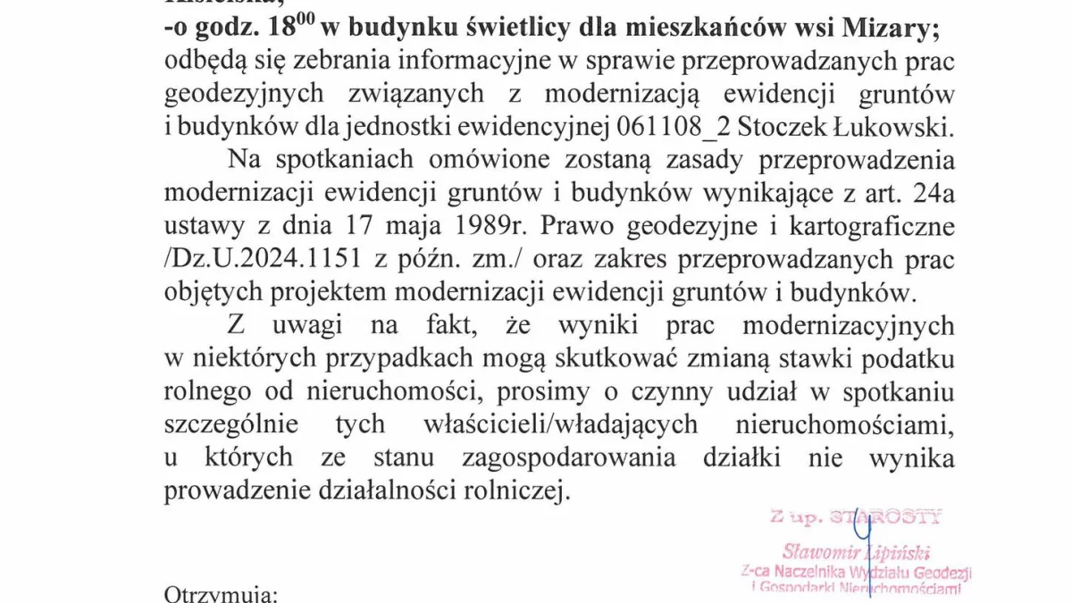 Starostwo zwraca uwagę, że wyniki modernizacji ewidencji mogą wpłynąć na wysokość podatku rolnego lub od nieruchomości.