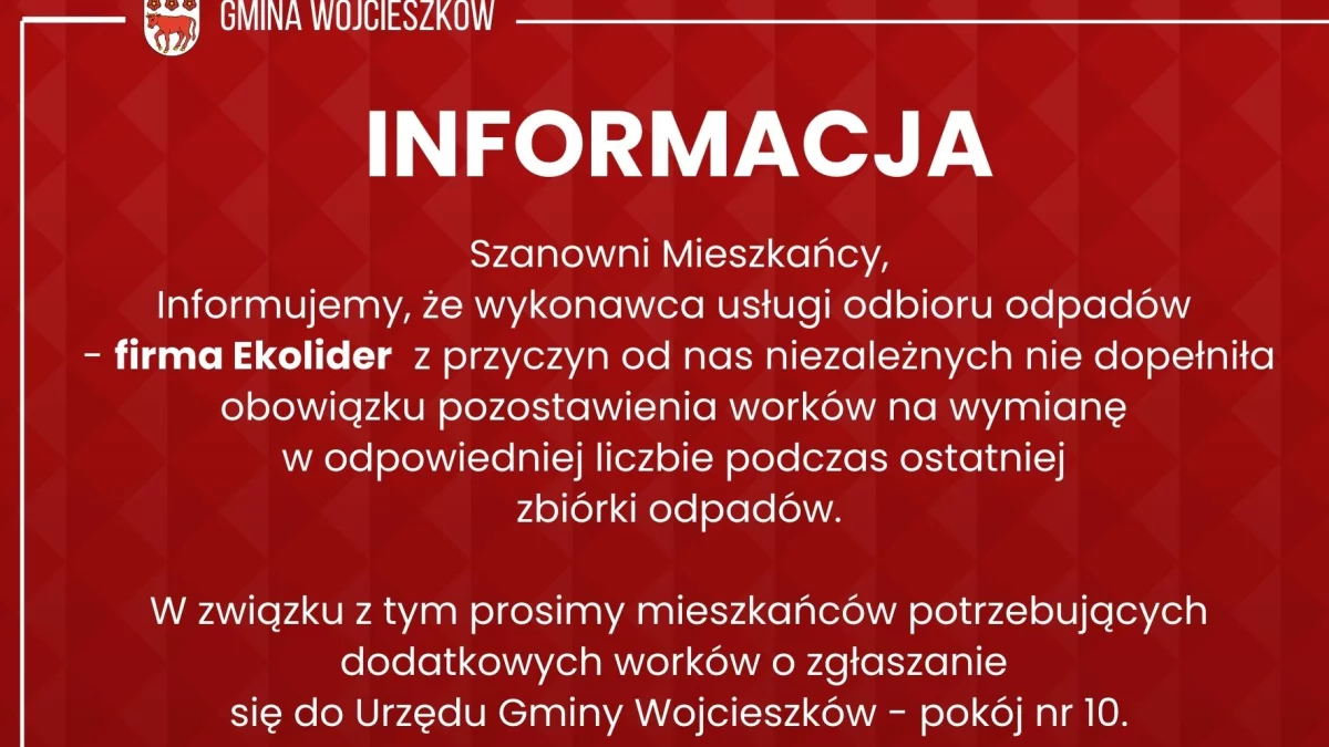 - Szanowni Mieszkańcy, Informujemy, że wykonawca usługi odbioru odpadów - firma Ekolider z przyczyn od nas niezależnych nie dopełniła obowiązku pozostawienia worków na wymianę w odpowiedniej liczbie podczas ostatniej zbiórki odpadów. W związku z zaistniałą sytuacją mieszkańcy potrzebujący dodatkowych worków mogą je odebrać w Urzędzie Gminy Wojcieszków (pokój nr 10). Jednocześnie informujemy, że od 2026 r. usługę odbioru odpadów realizować będzie Gminny Zakład Gospodarki Komunalnej Sp. z o.o. w Wojcieszkowie. Dziękujemy za wyrozumiałość – czytamy na fb gminy Wojcieszków.