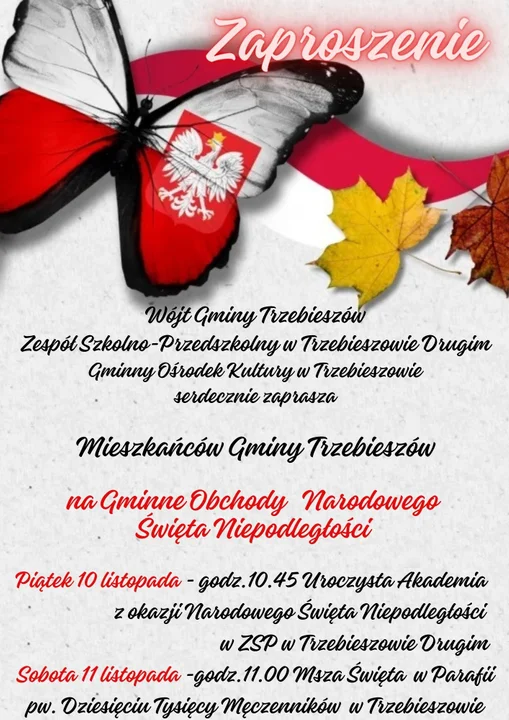 W piątek 10 listopada o godzinie 10:45 odbędzie się uroczysta akademia z okazji Narodowego Święta Niepodległości w Zespole Szkolno-Przedszkolnym w Trzebieszowie.