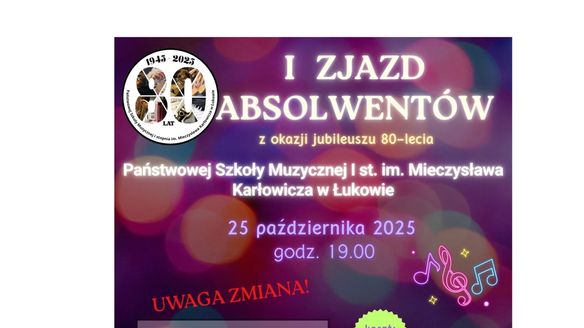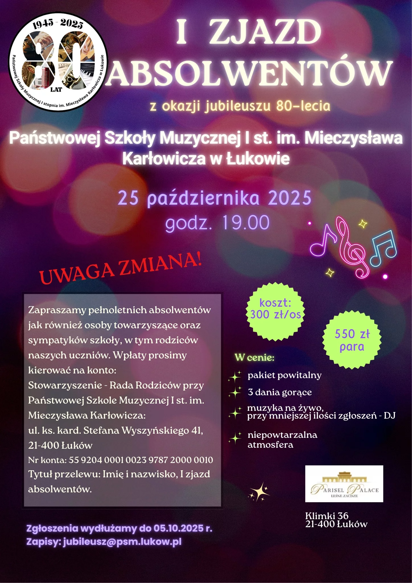 .Wpłaty należy kierować na konto Stowarzyszenia – Rady Rodziców przy PSM w Łukowie (szczegóły na plakacie). W tytule przelewu należy podać imię, nazwisko oraz dopisek „I zjazd absolwentów”.