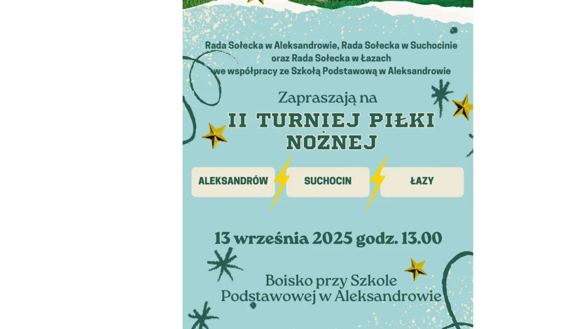 Wydarzenie organizują Rady Sołeckie z Aleksandrowa, Suchocina i Łazów we współpracy ze Szkołą Podstawową w Aleksandrowie. To już druga edycja turnieju piłkarskiego, która zapowiada się pełna sportowych emocji i dobrej zabawy.