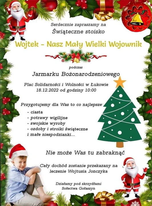 Na jarmarku będzie można kupić potrawy świąteczne, ciasta, ozdoby świąteczne, a także wesprzeć zbiórkę na leczenie Wojtusia Jonczyka, chorego na nowotwór złośliwy.