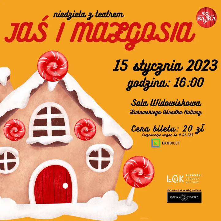 Bilety na spektakl teatralny „Jaś i Małgosia” w cenie 20 zł do nabycia są w kasie Kina Łuków oraz on-line. Rezerwacje ważne są do 9 stycznia 2023 roku.