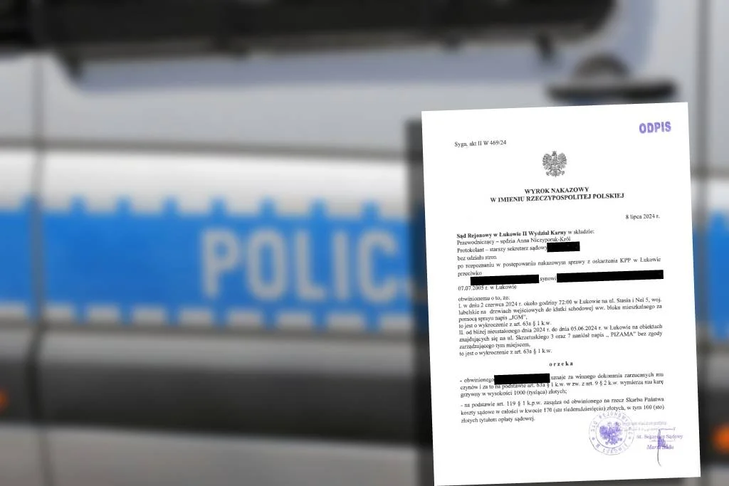 Łukowska Spółdzielnia Mieszkaniowa opublikowała w mediach społecznościowych wyrok przeciwko młodocianemu wandalowi. Nastolatek został uznany za winnego dwóch zarzutów. Pierwszy z nich dotyczył naniesienia napisu "JGM" na drzwiach wejściowych bloku mieszkalnego przy ul. Stasia i Nel 5 2 czerwca 2024 roku. Drugi zarzut obejmował naniesienie napisu "PIŻAMA" na obiektach znajdujących się przy ul. Skrzetuskiego 3 oraz 7 w nieustalonym dokładnie okresie do 5 czerwca 2024 roku.