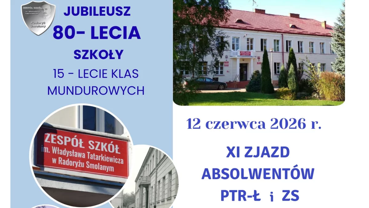 Uroczystości jubileuszowe odbędą się 12 czerwca 2026 roku w siedzibie Zespołu Szkół im. Władysława Tatarkiewicza w Radoryżu Smolanym.