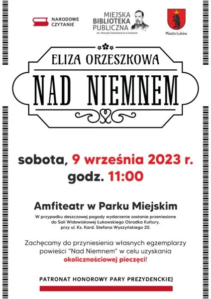 W przypadku deszczowej pogody wydarzenie zostanie przeniesione do Sali Widowiskowej Łukowskiego Ośrodka Kultury, przy ul. Ks. Kard. Stefana Wyszyńskiego 20. Zachęcamy do przyniesienia własnych egzemplarzy „Nad Niemnem ” w celu uzyskania okolicznościowej pieczęci. Patronat Honorowy nad imprezą objęła Para Prezydencka.