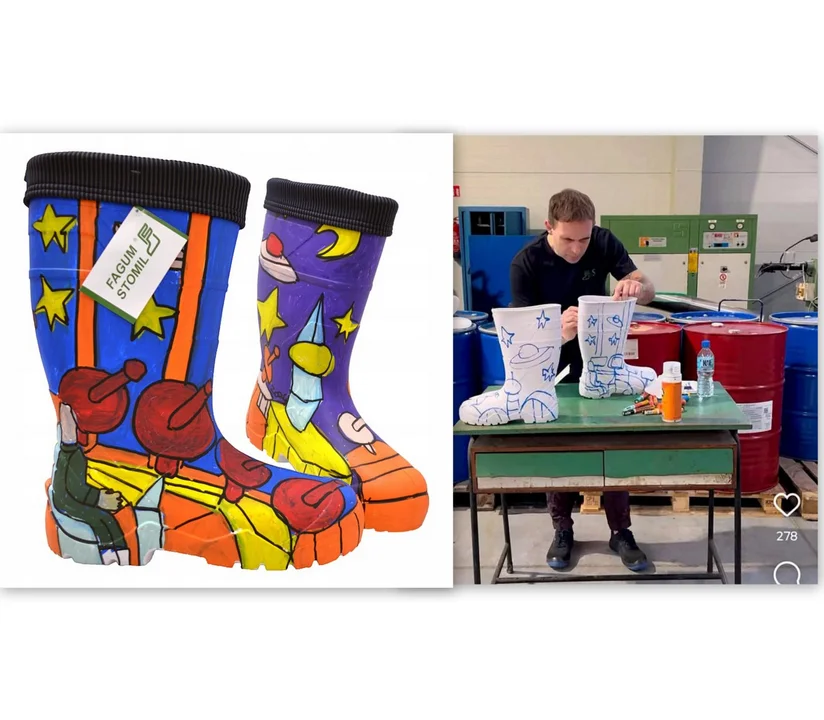Artysta pomalował swoje "kalosze szczęścia" w firmie Fagum Stomil w Łukowie. Do stworzenia kolorowego dzieła sztuki posłużyły kalosze z serii PREMIUM WHITE, produkowane w łukowskiej firmie