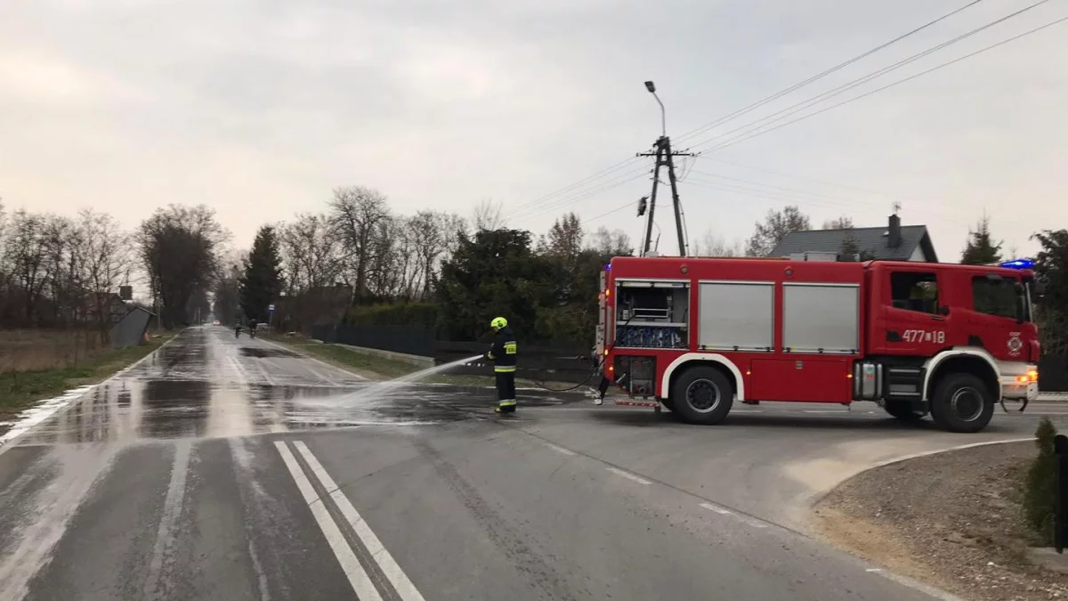 Strażacy wykorzystując specjalistyczny środek chemiczny usunęli zanieczyszczenie. Następnie cała powierzchnia drogi została dokładnie zmyta wodą.