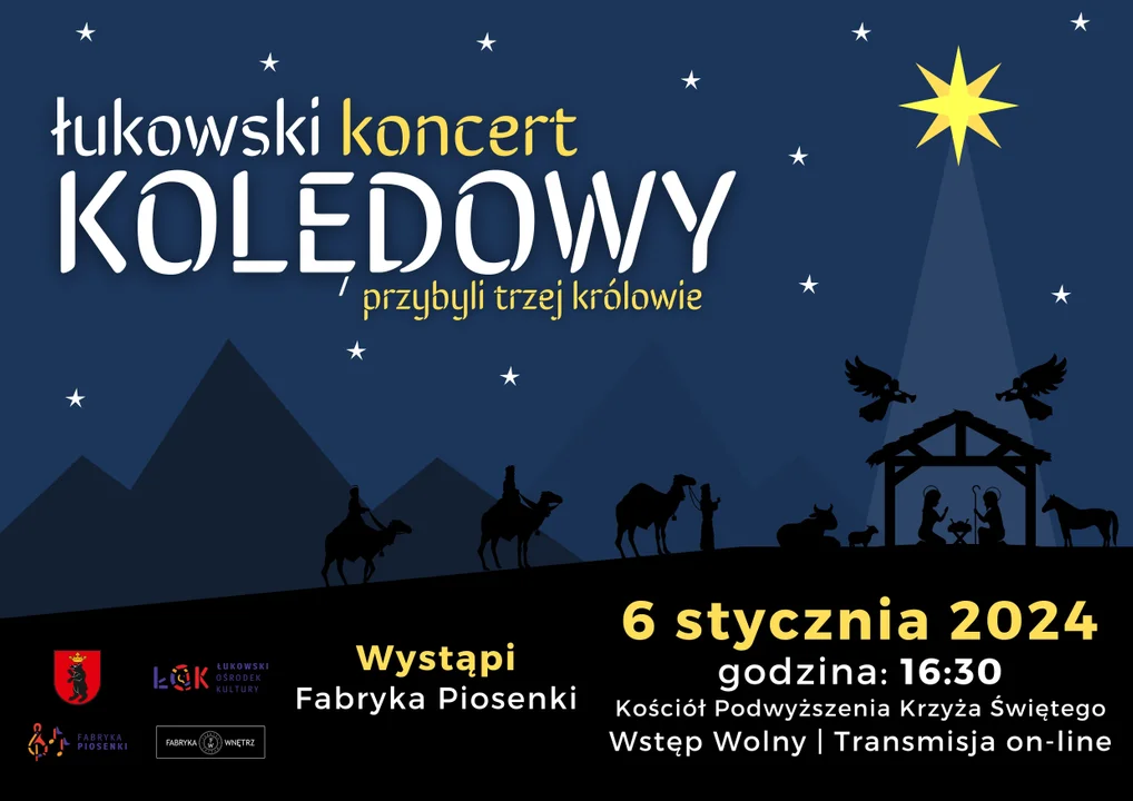 Na Łukowski Koncert Kolędowy zapraszają Miasto Łuków, Łukowski Ośrodek Kultury, Proboszcz Parafii Podwyższenia Krzyża Świętego w Łukowie Ksiądz Kanonik Andrzej Kieliszek oraz Mecenas łukowskiej kultury Fabryka Wnętrz.