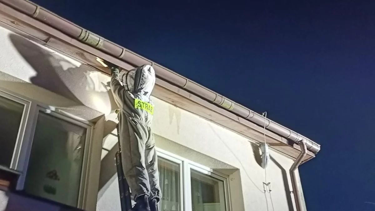 Dziś, przed godziną 21:00 zakończyła się akcja usuwania gniazda szerszeni z wielorodzinnego budynku mieszalnego przy ul. Szkolnej w Gręzówce. Pora oraz niebezpieczeństwo związane z rozdrażnieniem roju spowodowały, że akcja nie należała do najłatwiejszych. Strażacy pracowali przy użyciu drabiny, kombinezonów ochronnych oraz specjalistycznych narzędzi. Musieli dodatkowo wspomóc się dodatkowym sprzętem oświetleniowym.