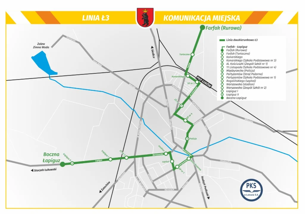 Usługę realizować będzie PKS w Łukowie S.A. Pierwszy kurs z ul. Łapiguz na ul. Farfak zaplanowano o godz. 5:00. Ostatni autobus będzie natomiast odjeżdżać z ul. Farfak o godz. 20:30.