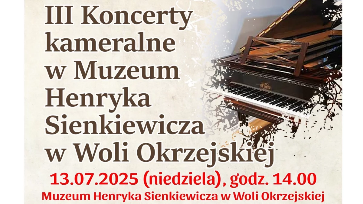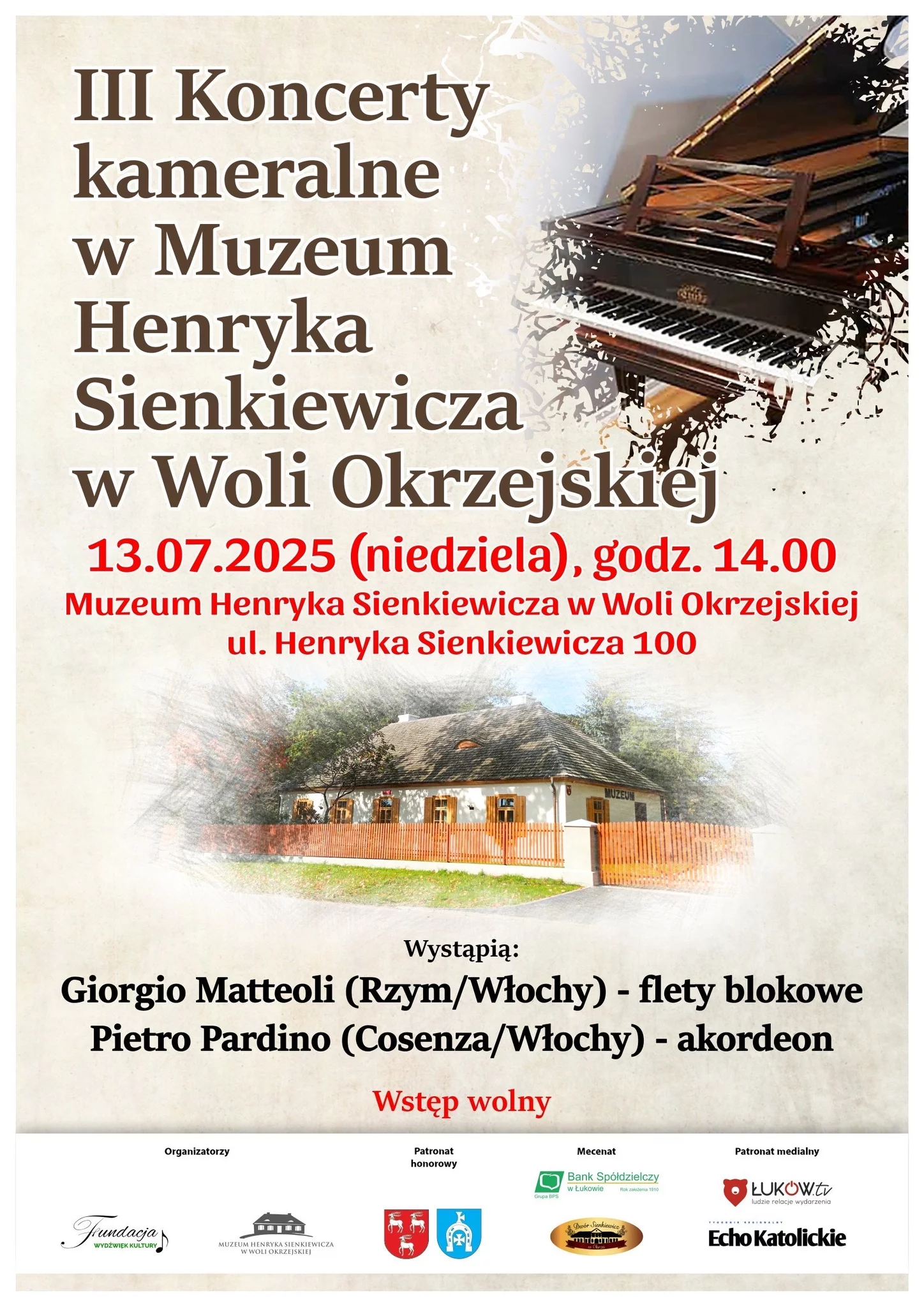 Muzeum Henryka Sienkiewicza w Woli Okrzejskiej serdecznie zaprasza na trzeci w tym roku koncert kameralny, który odbędzie się w niedzielę, 13 lipca 2025 roku o godz. 14:00. W zabytkowych wnętrzach muzeum noblisty zabrzmią utwory mistrzów muzyki klasycznej – w programie m.in. kompozycje J.S. Bacha, E. Griega oraz E. Satiego. Wstęp wolny.