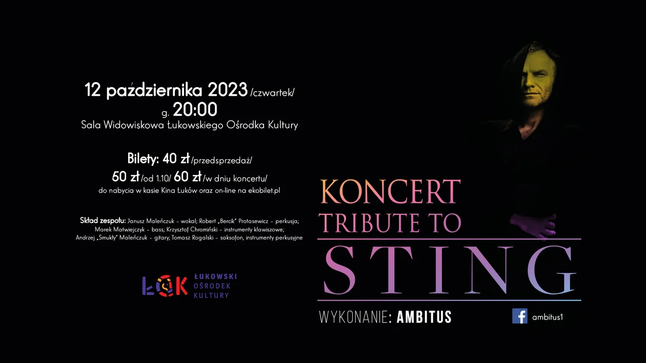 „Englishman In New York", „Shape Of My Heart" czy „Roxanne" to niezapomniane przeboje Stinga, które na pewno usłyszymy w Łukowskim Ośrodku Kultury. Oprócz nich wiele, wiele innych. Będzie to wspaniałe wydarzenie poświęcone jednemu z najgenialniejszych muzyków naszych czasów. Ambitus to grupa doskonałych muzyków specjalizujących się w wykonywaniu coverów i koncertów tematycznych typu tribute. Poza Stingiem wykonują także muzykę m.in. Seweryna Krajewskiego czy zespołu Queen. Grupę tworzą: Janusz Maleńczuk (wokal), Robert „Bercik" Protasiewicz (perkusja), Marek Matwiejczyk (bas), Andrzej „Smukły" Maleńczuk (gitary), Tomasz Rogalski (saksofon, instrumenty perkusyjne) oraz Krzysztof Chromiński (instrumenty klawiszowe).