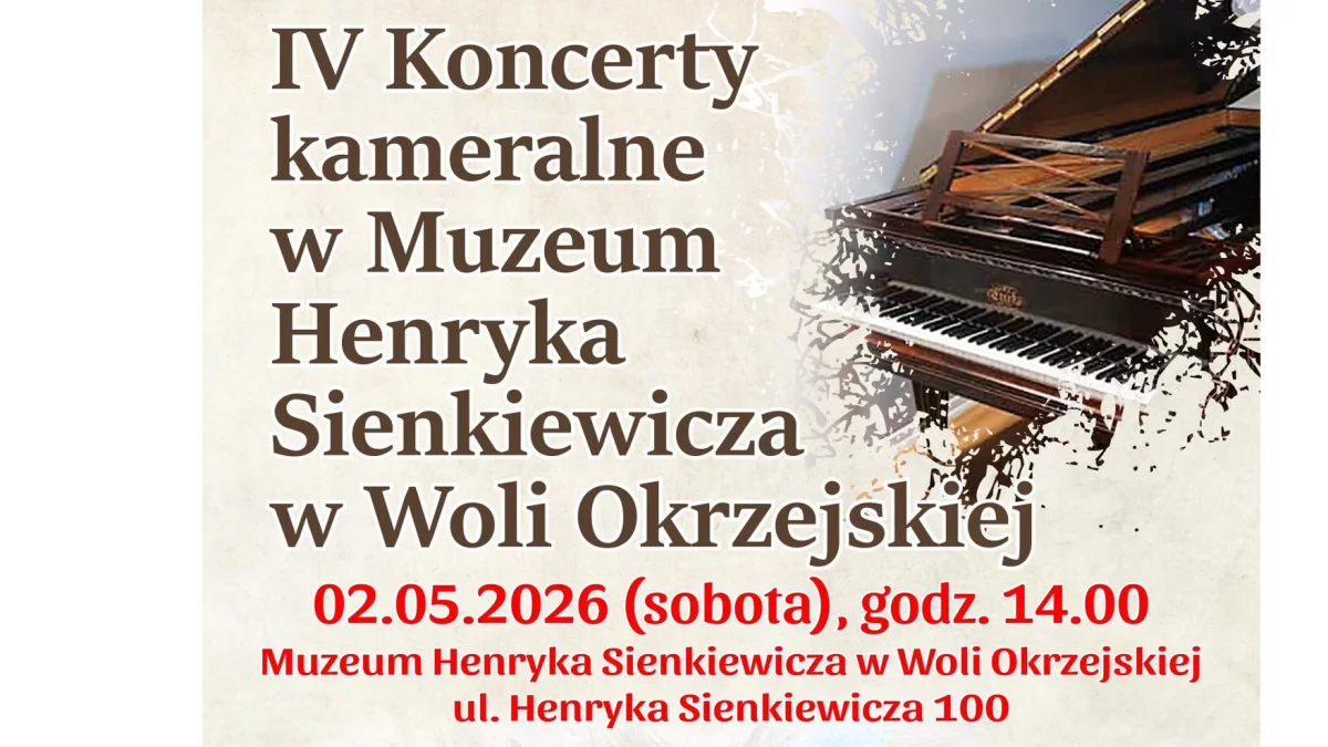 Fundacja Wydźwięk Kultury oraz Muzeum Henryka Sienkiewicza w Woli Okrzejskiej zapraszają na koncert inaugurujący „IV Koncerty kameralne”. Wydarzenie odbędzie się 2 maja 2026 roku o godz. 14:00.