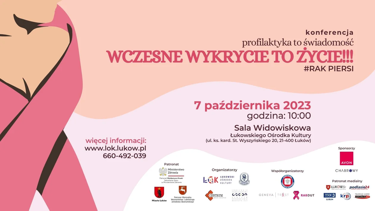 Zapraszamy wszystkich mieszkańców Łukowa i okolic na konferencję „Profilaktyka to świadomość #rak piersi - wczesne wykrycie to życie!!!". Wydarzenie obędzie się w sobotę 7 października o godz. 10:00 w sali widowiskowej Łukowskiego Ośrodka Kultury.