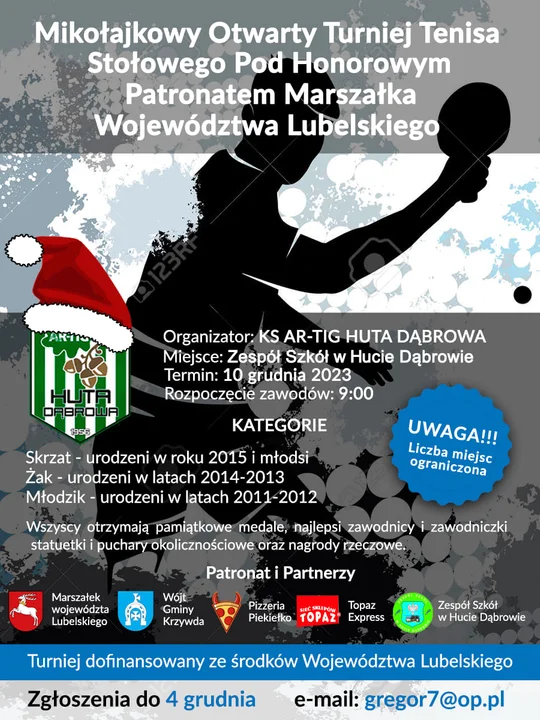 Rywalizacja w Zespole Szkół w Hucie Dąbrowie będą się odbywać w trzech kategoriach wiekowych. W pierwszej powalczą "skrzaty", urodzone w 2015 roku i później. W drugiej kategorii "żak" zmierzą się pingpongiści z roczników 2014 - 2013, a w "młodzikach" zagrają zawodniczki i zawodnicy, którzy urodzili się w latach 2011 - 2012.